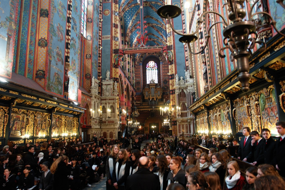 クラクフ滞在の2日目は、日ポの歴史に刻むべく1日となりました。中央広場の一角にある聖マリア教会の大聖堂で、仙台白百合学園とクラクフ市民合同による東日本大震災を追悼するミサが行なわれたのです。 前編そしてこの度も前述した通り、クラクフ歴史地区は1978年、ユネスコの世界遺産に登録された第1号の世界遺産(文化遺産)であり、1222年に同地区に建造されたゴシック建築の聖マリア教会も世界遺産に含まれています。12年の歳月を費やして完成された中央正面のヴィオレットストウオシ聖壇は、国宝にも指定されています。ショパン没後150年の1999年5月には、ベルリン・フィルハーモニー管弦楽団(ベルナルト・ハイティンク指揮)によるヨーロッパ・コンサートが大聖堂で行なわれ話題となりましたが、同教会に限らずポーランドの教会は観光地化されておらず、国民の約95%を占めるカトリック教徒がミサに参加し、お祈りを捧げる神聖な場です。 「東日本大震災で甚大な被害を受けた、宮城県の女子高校生たちがクラクフを訪れる!」 このニュースが早々にアンジェイ・イェレン神父の耳に届き、「ポーランドの高校生たちと共に、私の教会で追悼ミサを捧げましょう!」と決断、司式を務めてくださることになったのでした。 それに伴い、日ポ両国の高校生による準備も始まりました。アンジェイ神父は聖マリア教会で奉職する10数人の神父の1人で、しかも若手の神父ですが〝重鎮扱い″なのだそうです。社会主義体制から民主化へ移行し、90年代以降、ポーランド国民が堂々と教会へ通えるようになりましたが、若者層にとって少なからず宗教離れ現象が起きている中、地元の若年層から圧倒的に支持されているためです。一般的に神父は5年単位で他の教区へ移動するそうですが、アンジェイ神父はすでに10年以上、聖マリア教会に奉職しています。 追悼のための合同ミサの参列者は1200人ほど、サンスター日本語学校と地元クラクフ第1高校の生徒他、中央広場に面した大聖堂の前にも多くの市民が集まりました。 「津波の困難を乗り越え、今ここで合同のミサをあげられることを嬉しく思う」という神父の日本語での挨拶の後、〝キリエ″が聖堂に静かに響き渡りました。聖歌隊を務めたのは欧州の高校合唱コンクールで優勝の常連校、クラクフ第1高校の合唱団です。 美しい荘厳な歌声でした。 設立からおよそ800年、史上初めてとなるポーランドと日本の合同ミサです。大聖堂に厳かなパイプオルガンの音が響き渡る中、第一朗読、答唱詩編、福音朗読と続きます。仙台白百合学園の生徒が聖書を朗読し、ポーランド語で聖歌も歌い、また「ポーランドからの手紙に勇気づけられた」ことへの感謝の報告など皆、次々と大役をこなしていきました。 この大聖堂のパイプオルガンの演奏も、同学園の生徒、齋藤華子さんが務めました。アンジェイ神父から事前に、「日本の高校生に弾いてもらいましょうか?」との提案があったのです。プロ奏者以外、誰もこのパイプオルガンを弾いた者がいない中、史上初の掟破りを許されたのが日本人で、しかも素人の女子高校生でした。 大役に選ばれ、仙台白百合学園のお御堂にあるパイプオルガンで猛練習をした齋藤さんですが、前日のリハーサルではわずか30分ほど弾くことを許されただけ、つまり、ほぼぶっつけ本番となりました。「実際弾いてみると鍵盤が意外と硬くて大変だったけれど、弾き始めると全くプレッシャーなく自然に弾けました」と本人はケロリ。ノーミスでの素晴らしい演奏に、ポーランド側も感動したそうです。 『主は水辺に立った』を同学園の生徒がポーランド語で歌い、クラクフ第1高校の合唱団が日本語で歌い、ミサは閉祭しました。日本語とポーランド語で追悼のための合同ミサが進行するよう、両国の言語が半分半分になるよう、進行表の作成にも1カ月ほど苦心したのでした。 東日本大震災からの苛酷な日々が、それぞれの脳裏に走馬灯のように蘇ってきたのでしょうか……。同学園の生徒たちは皆、泣いていました。 すると突然、聞き覚えのあるメロディを、クラクフ第1高校の合唱団が歌い始めました。それは、仙台白百合学園100周年イメージソング『広がる愛 未来へ』でした。 まさにサプライズでした。日本語の歌詞をサンスターの生徒たちがポーランド語に翻訳し、それを第1高校の合唱団が3カ月の練習を重ね、本番に挑んだのでした。 「初めて聴くポーランド語での『広がる愛 未来へ』は優しく我々を包み込み、色々な思いが込み上げ涙が溢れてきました」と阿部教頭も回想しています。家族や親戚、友人や知人を亡くし、九死に一生を得ても大地震や津波の恐怖などにより、心に大きな傷を抱える人々が周囲にまだ大勢いる中、一行は異国のこの地で〝癒し″に包まれたのです。 余談ですが、第1高校の合唱団は10代の日本人女性のキーの高さに「宇宙人レベルの高音!」と驚いたそうです。オリジナルの日本語バージョンのままのキ